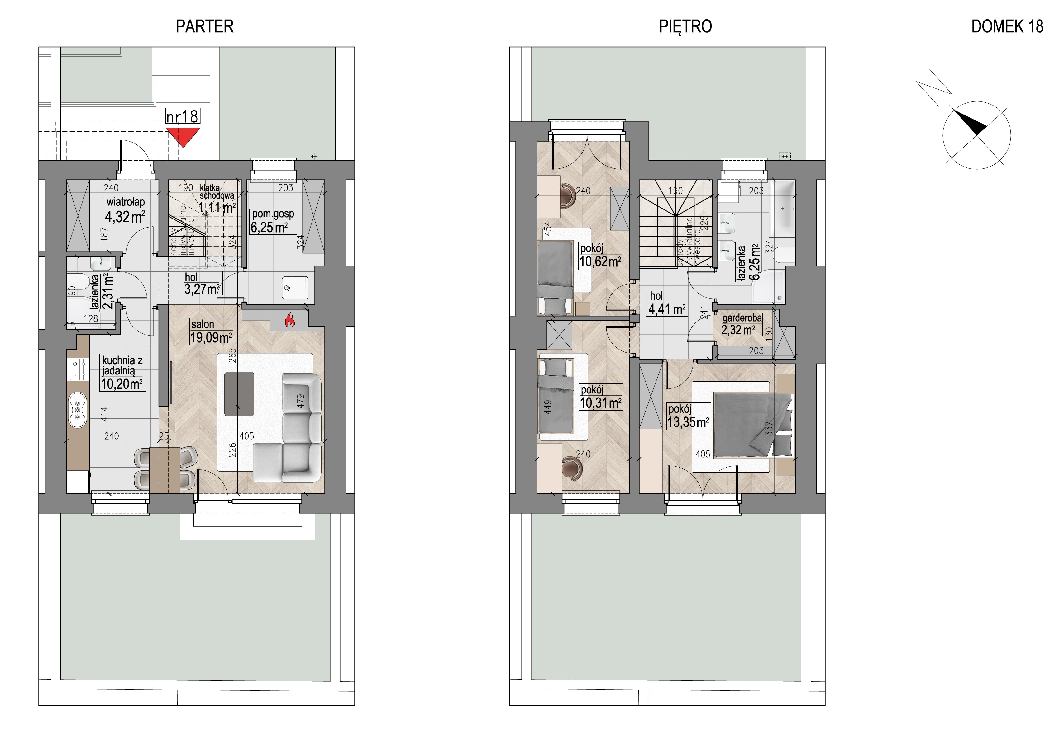 Domy posiadają funkcjonalne układy pomieszczeń. Na parterze znajduje się wiatrołap, przestronny salon, kuchnia, łazienka i garaż lub pomieszczenie gospodarcze. Na piętrze są trzy lub cztery sypialnie, garderoba oraz łazienka.