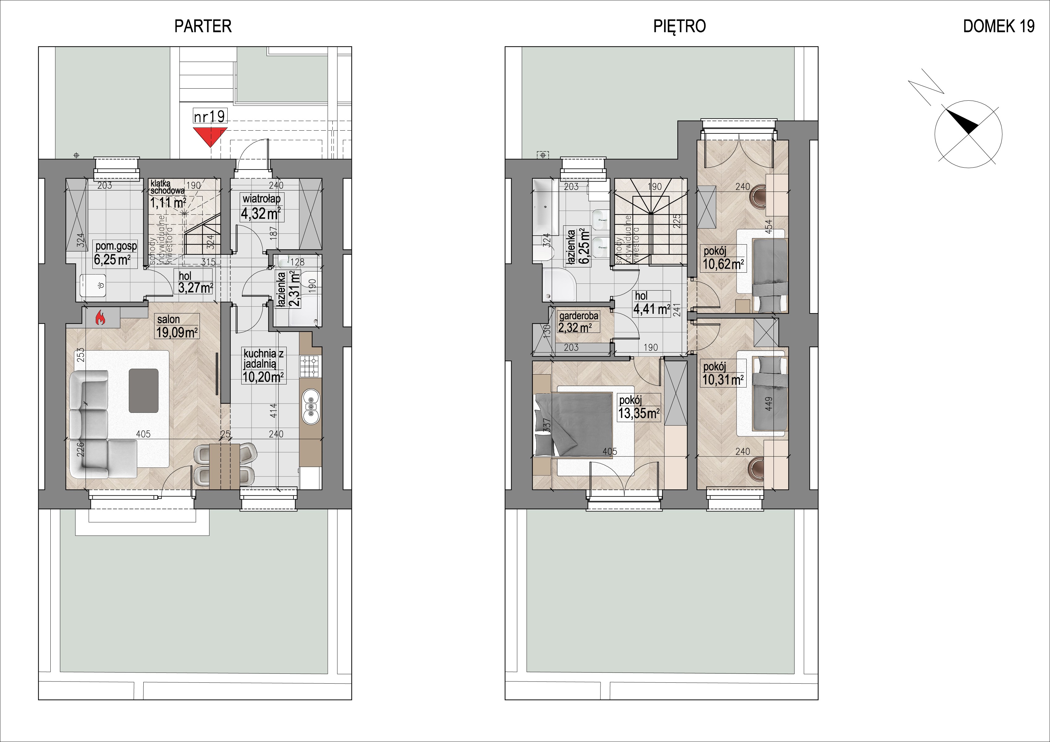 Domy posiadają funkcjonalne układy pomieszczeń. Na parterze znajduje się wiatrołap, przestronny salon, kuchnia, łazienka i garaż lub pomieszczenie gospodarcze. Na piętrze są trzy lub cztery sypialnie, garderoba oraz łazienka.
