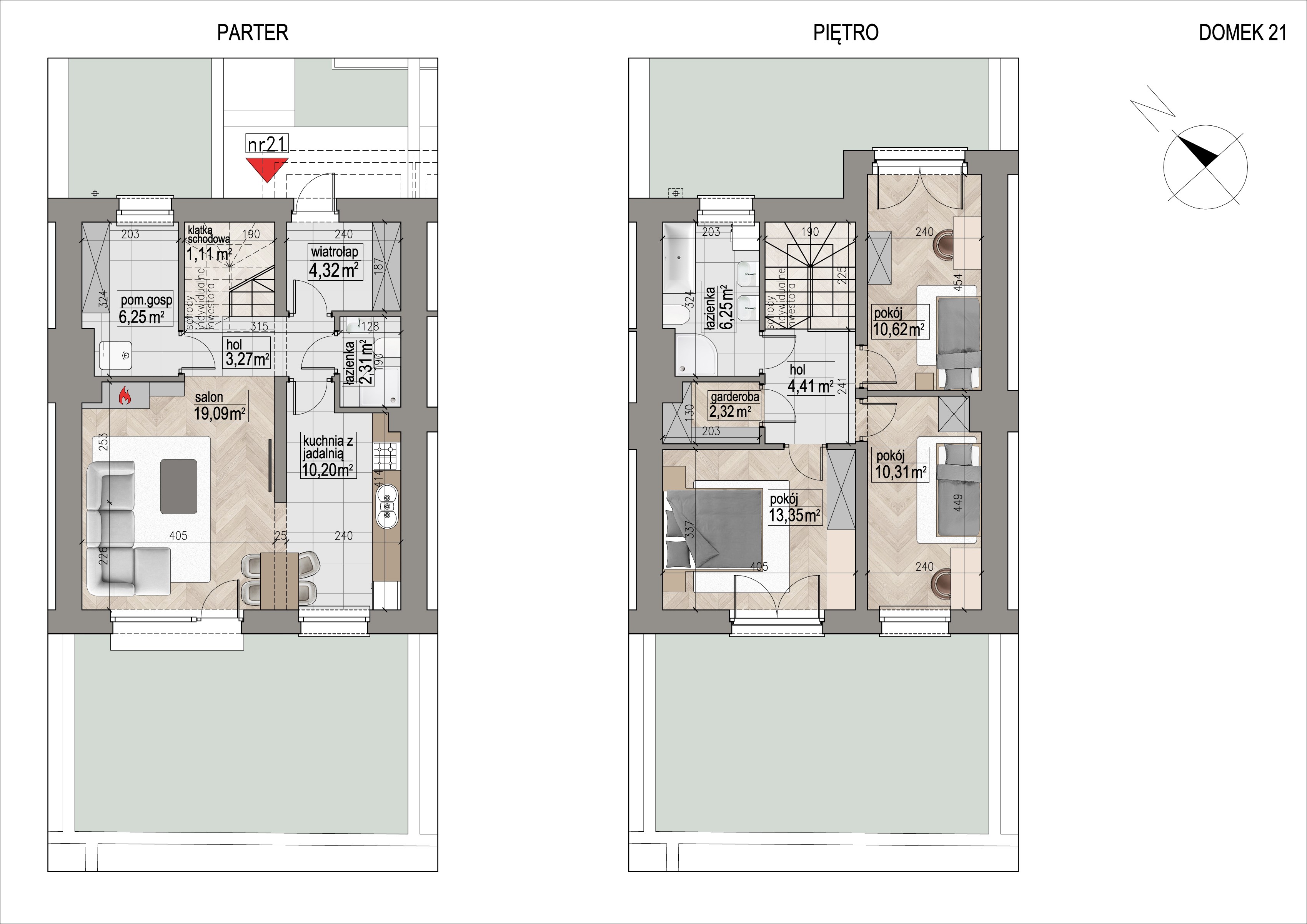 Domy posiadają funkcjonalne układy pomieszczeń. Na parterze znajduje się wiatrołap, przestronny salon, kuchnia, łazienka i garaż lub pomieszczenie gospodarcze. Na piętrze są trzy lub cztery sypialnie, garderoba oraz łazienka.