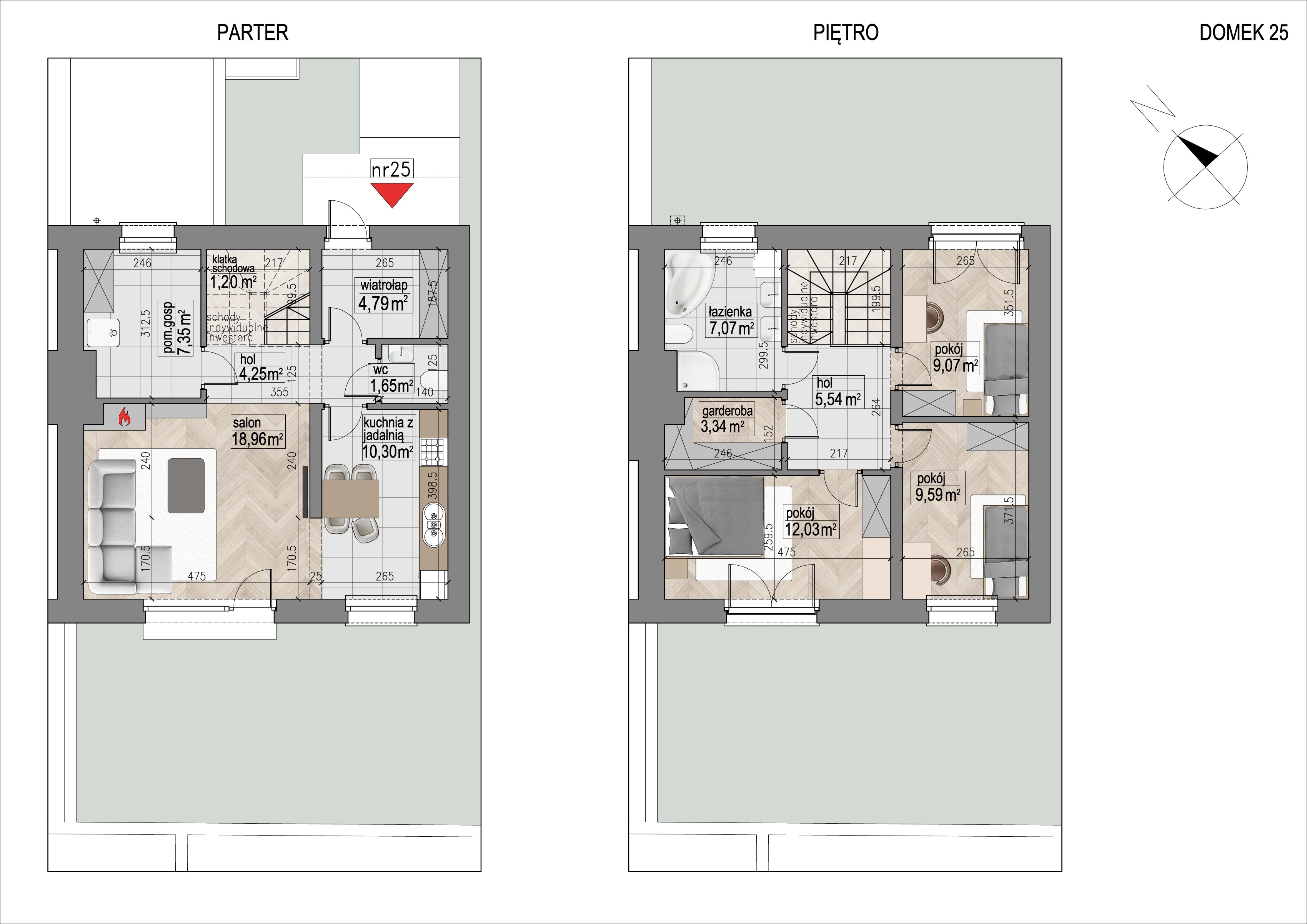 Domy posiadają funkcjonalne układy pomieszczeń. Na parterze znajduje się wiatrołap, przestronny salon, kuchnia, łazienka i garaż lub pomieszczenie gospodarcze. Na piętrze są trzy lub cztery sypialnie, garderoba oraz łazienka.