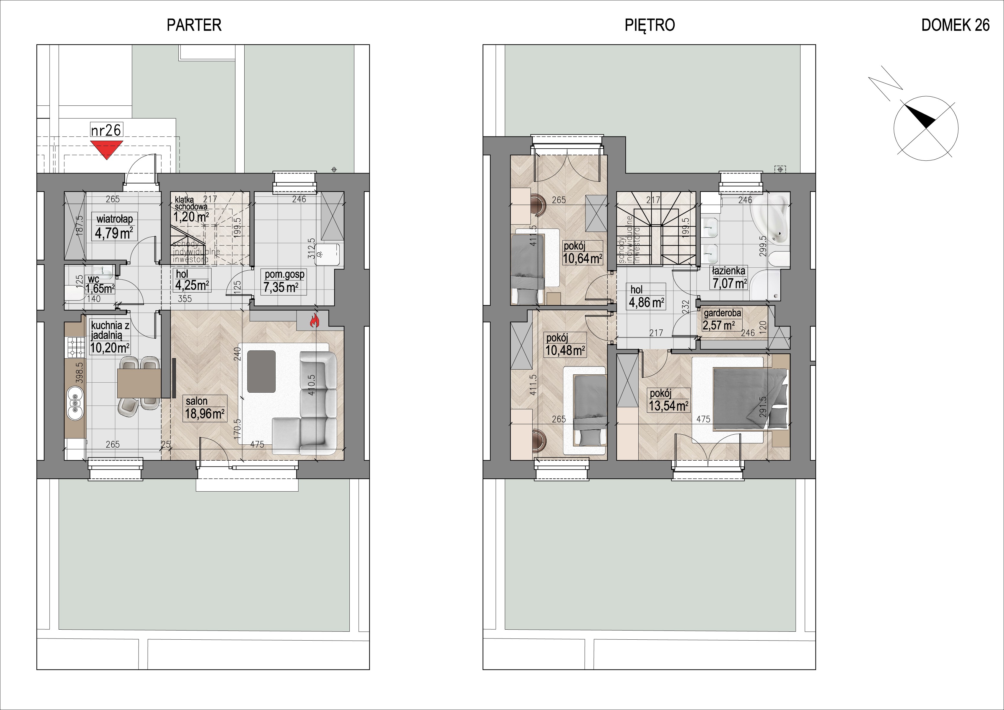 Domy posiadają funkcjonalne układy pomieszczeń. Na parterze znajduje się wiatrołap, przestronny salon, kuchnia, łazienka i garaż lub pomieszczenie gospodarcze. Na piętrze są trzy lub cztery sypialnie, garderoba oraz łazienka.