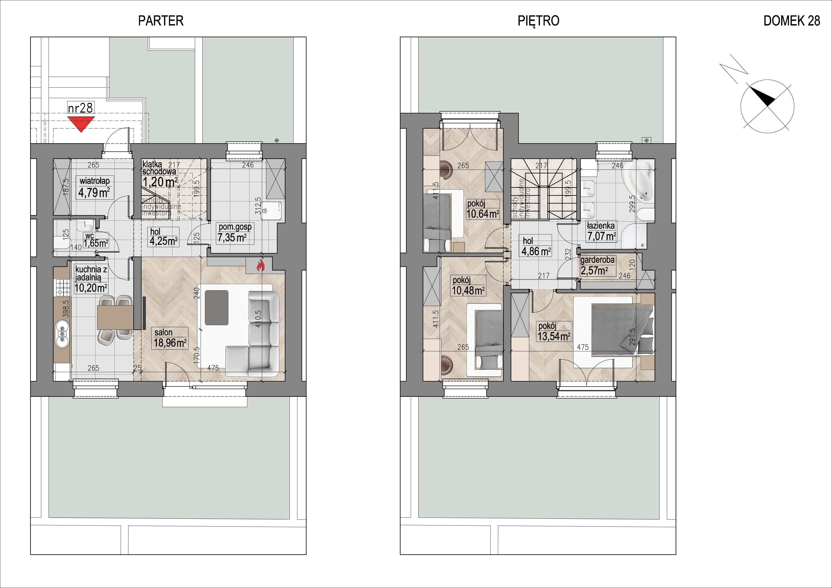 Domy posiadają funkcjonalne układy pomieszczeń. Na parterze znajduje się wiatrołap, przestronny salon, kuchnia, łazienka i garaż lub pomieszczenie gospodarcze. Na piętrze są trzy lub cztery sypialnie, garderoba oraz łazienka.
