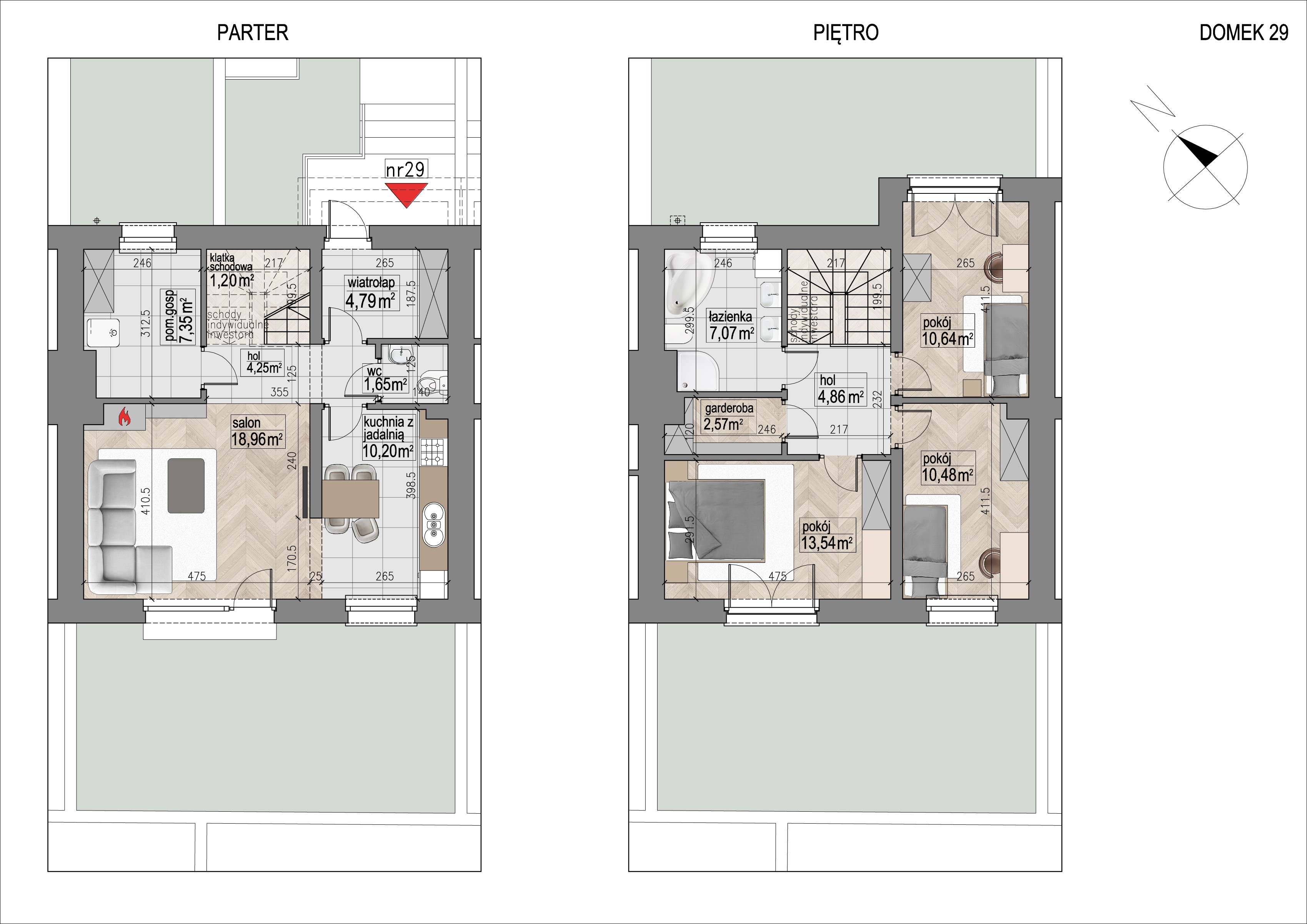 Domy posiadają funkcjonalne układy pomieszczeń. Na parterze znajduje się wiatrołap, przestronny salon, kuchnia, łazienka i garaż lub pomieszczenie gospodarcze. Na piętrze są trzy lub cztery sypialnie, garderoba oraz łazienka.